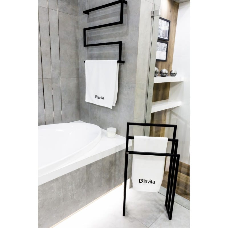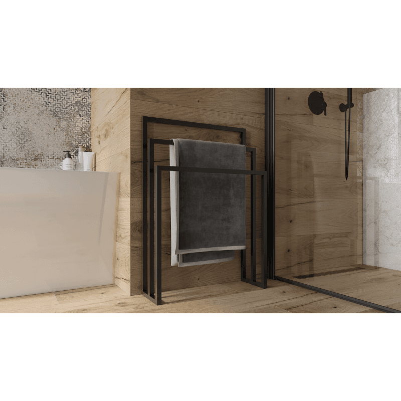 Handdukshållaren Seram 60 har en stilren design i mattsvart pulverlackerat stål, vilket ger både ett modernt och tåligt intryck. Med sina mått på 60x20x85 cm är den perfekt för att hänga upp handdukar på ett organiserat sätt. Det eleganta materialvalet säkerställer långvarig hållbarhet samtidigt som den passar in i de flesta badrumsstilar.